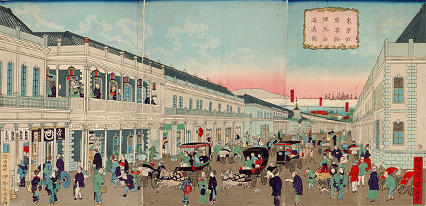 “Ginza, el importante camino de ladrillo y piedra en Tokio” realizada por Utagawa Kokki (segunda generación) en el año Meiji 6 (1873)